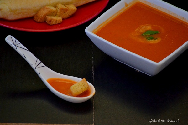 3.When pressure goes open and discard the bay leaves and cloves, and grind the remaining ingredients to smooth puree. Now Heat a pan and simmer it for 2 to 3 mins.Serve warm with croutons/bread sticks.